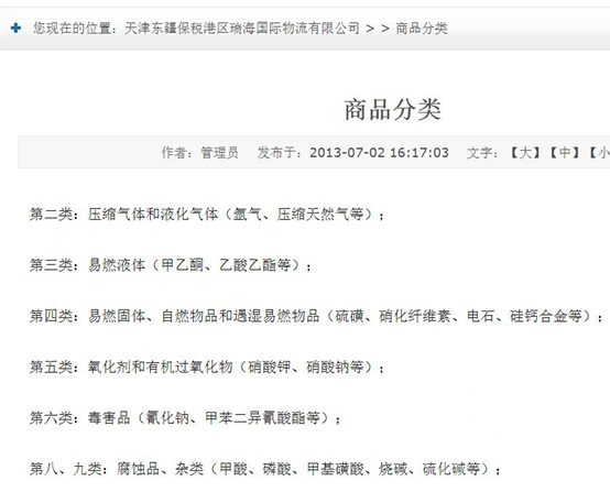 稍早的报道显示,爆炸源自滨海新区天津港7号卡子门瑞海国际物流公司危险品仓库集装箱堆场。这个堆场中存放了大量电石、硅钙合金、氰化钠、甲苯二异氰酸酯(TDI)、烧碱、硫化碱、氩气、甲乙酮、乙酸乙酯、硝化纤维素、硫磺、硝酸钾、硝酸钠、甲酸、磷酸、甲基磺酸、压缩天然气等危险品和PVC、天热橡胶等普通货物。